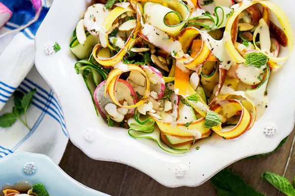 经典的蔬菜色拉(法语,勿庸置疑,“生的东西”)通常由西兰花,胡萝卜,芹菜,黄瓜,柿子椒,菜花,西红柿,茴香,芦笋和青豆。与被服务的油醋汁要么奶油浸的蔬菜作为一个清新,明快,醒目的晚餐前的开胃菜或小吃。