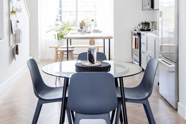 虽然我最喜欢有大椅子的餐厅,但有时狭小的空间不允许这样的奢侈。这时宜家的凳子就派上用场了。这个软木顶的Sinnerlig凳子(可惜没有)在这个狭小的厨房兼餐厅空间里看起来超级别致。它确实增加了一剂质地和视觉趣味。
