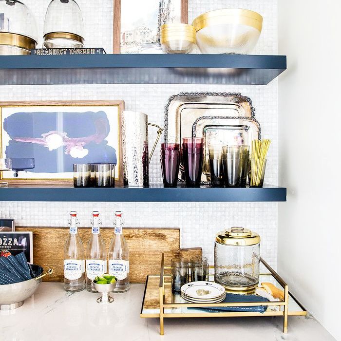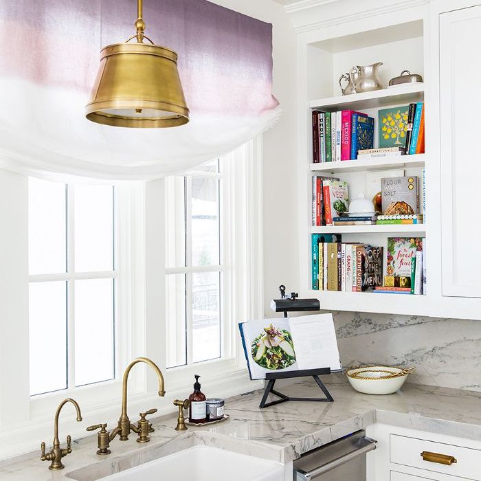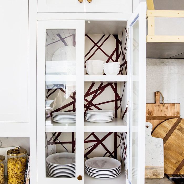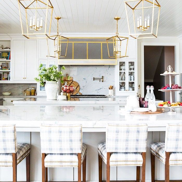 这一切都始于一个大师Kelly Wearstler壁纸深李子笔触。“我们有艾米丽告诉我们在她的衣柜里一些她最喜欢的作品,我们被她的美乐的启发,在膝盖的斯图尔特·韦茨曼靴子是她去-TOS过去的这个赛季,”斯蒂芬森说。将它们添加到玻璃镶板橱柜背面是给这种全白的厨房一些生活的完美方式。