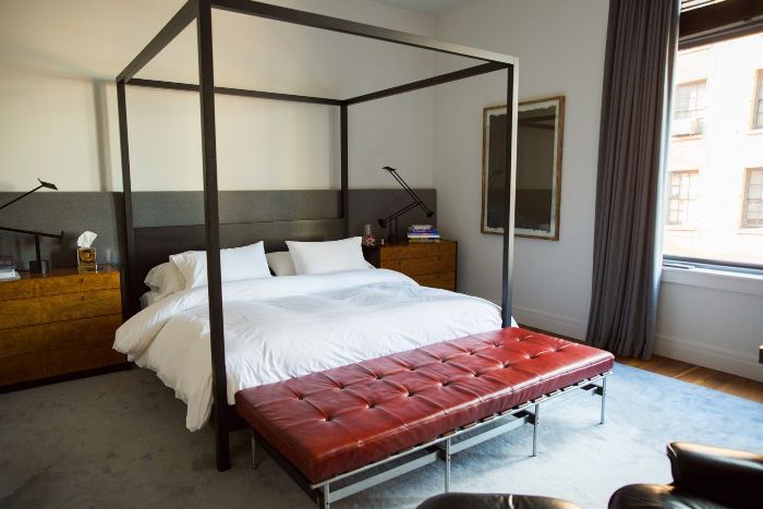 卧室是在吴的家中最引人注目的空间之一,采用了深邃的黑色和白色的配色方案,一个大胆的皮革替补。