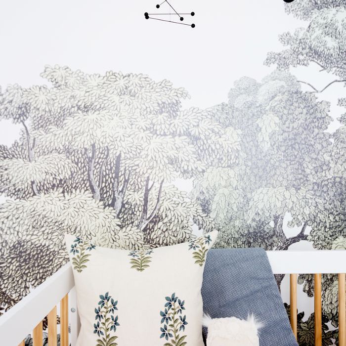 “刚开始的时候,后墙是一大片白色。相比之下,这会让婴儿床感觉像是漂浮着的,没有锚定。这张壁纸真的解决了这个困境,我们没有回避这个问题,而是决定让这面墙成为刻意的焦点,同时也给它带来一些温暖。”