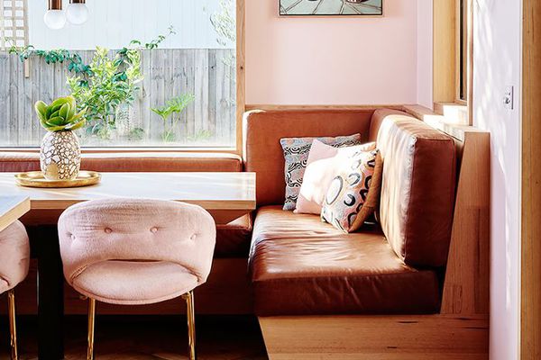 当被问及家里最喜欢的部分时,达文肯定地回答:“光。”整个房子有很好的光线,感觉开阔、通风,但同时又舒适。”她说。这个被称为“阳光室”的休息区确实如此,这里有透明的百叶窗来过滤加州的温暖光线。Jennifer Shorto设计的蓝色抱枕为原本中性的空间增添了一抹色彩。