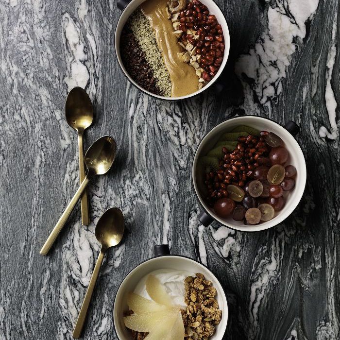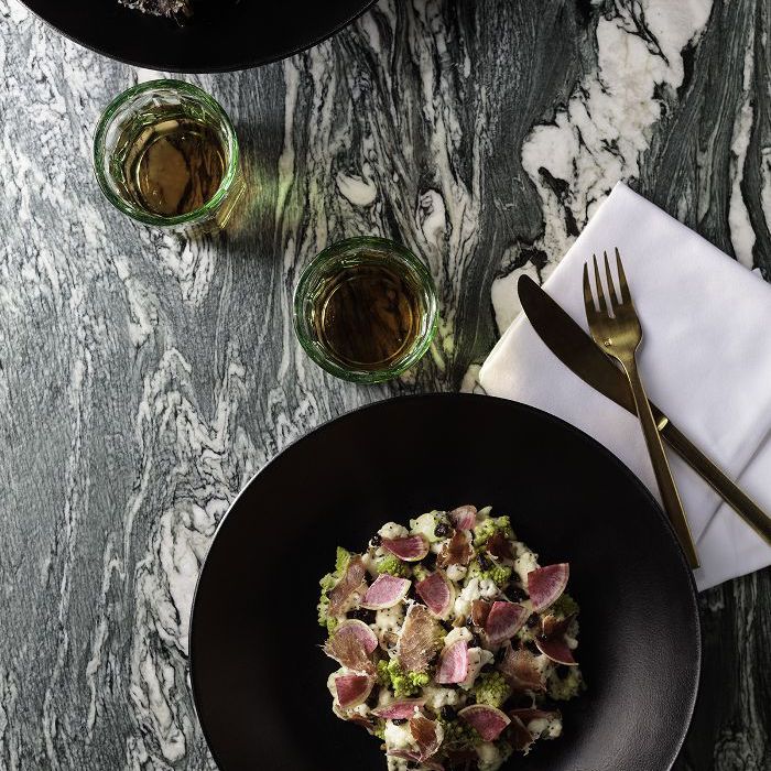 该Cipollino大理石酒吧提供中投放的食物和饮料的惊人的背景。这种材料制成的灰色和白色脉纹对比与黑色板和金餐具精美的旋涡。它只是乞求你后你的膳食的Instagram的。