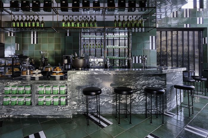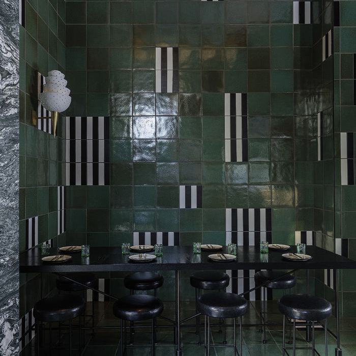 受法国概念艺术家Daniel Buren和“分离时代”的启发,现代主义艺术家从学术艺术中分离出来,室内充满了引人注目的细节、引人注目的设计和大胆的色彩,所有这些都包含着设计和艺术爱好者将会抓住的线索。丰富的,光滑的绿色瓷砖创造了一个忧郁的氛围,而温暖的元素,如黄铜,cerused木材,和天然石制品,创造了一个充满永恒魅力的邀请空间。你见过比这绿色瓷砖和灰白色大理石吧台更梦幻的组合吗?