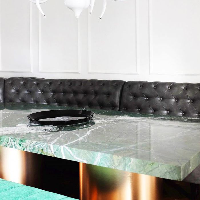 这种皮革软长椅设计由莎拉·库珀实际上是在餐厅里,我们很少看到。尽管这些材料——黄铜、天鹅绒、绿色大理石和簇绒皮革——相当奢华,但也并不珍贵,肯定可以承受一个家庭的来来往往。