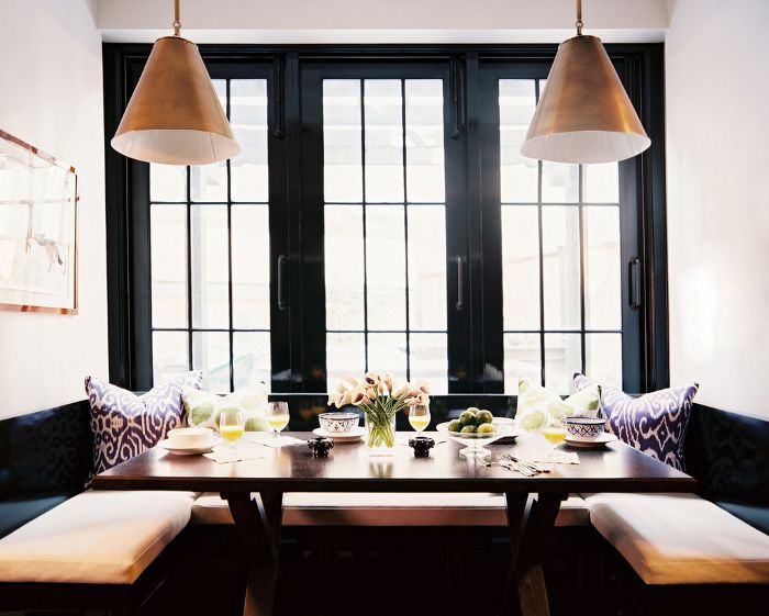 通过画长椅和周围的窗玻璃黑色,克里斯蒂娜·墨菲内饰给这个厨房长椅一个迷人的大都市的样子。我们爱照亮了整个空间的黄铜灯具。