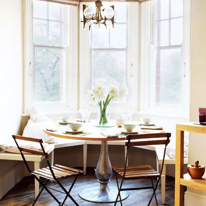 一个弯曲的凸窗是一个完美的地方早餐角落!这张长凳,很有特色骨牌,也就是我们喜欢称之为“农家时尚” -elegant而质朴。