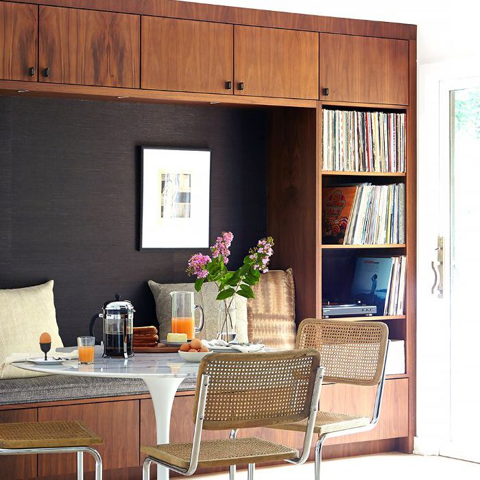 的莱昂国王的纳什维尔的家打击乐纳丹·福洛威尔,旨在通过本杰明Vandiver他的厨房里有一条很有男人味的漂亮长凳,嵌在墙上,四周都是唱片。我们喜欢它时髦的、受上世纪中叶影响的美学。