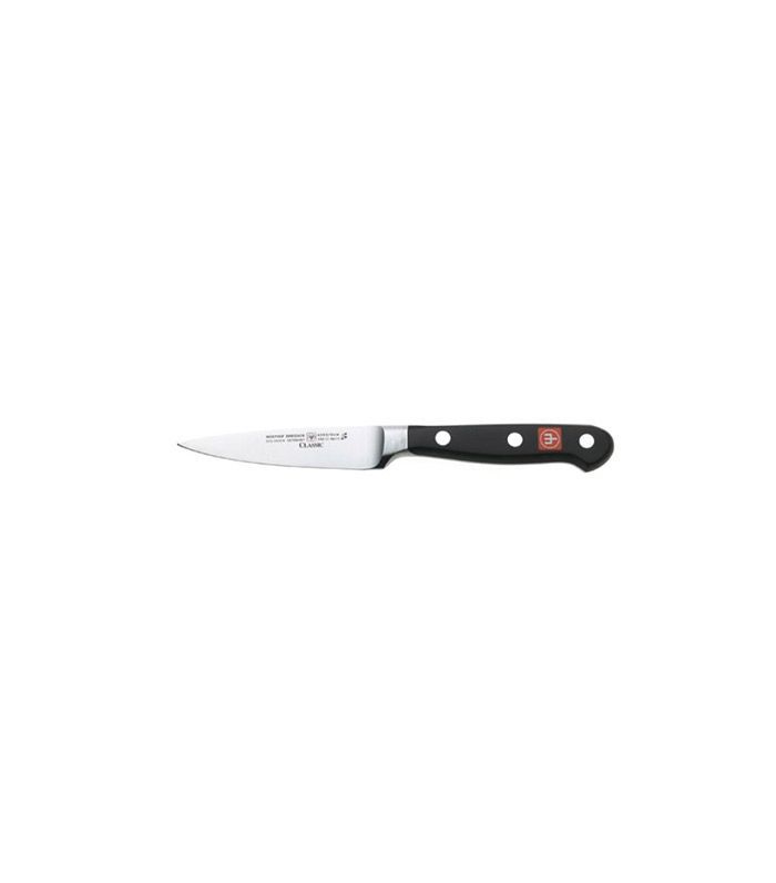 Basically a miniature chef’s knife, the paring knife is best used for smaller-scale jobs like peeling fruits and vegetables, removing the top from strawberries, deveining shrimp, or removing seeds from hot peppers—basically anything that the chef’s knife might be too clumsy and oversize for.