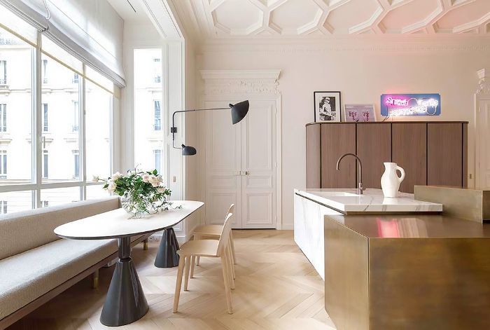 受人信赖的早餐角落也正在经历一个复兴时期,以现代的方式重新诠释,阅读更少《广告狂人》厨房和更多的优雅,悠闲的用餐空间。在这个巴黎的厨房,一个超大的长椅坐在窗户下面,创造了完美的休闲用餐体验。