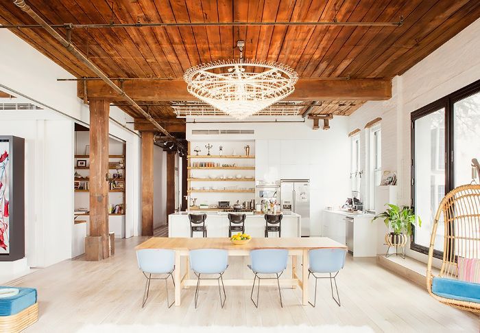 在布鲁克林的威廉斯堡附近的这间阁楼空间,整个生活区打开了厨房,给这个家庭一个机会花更多的时间在一起,并为较大的群体提供了极大的娱乐空间。