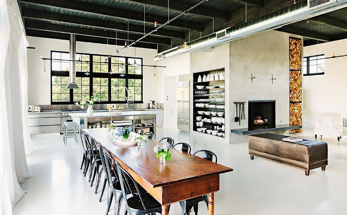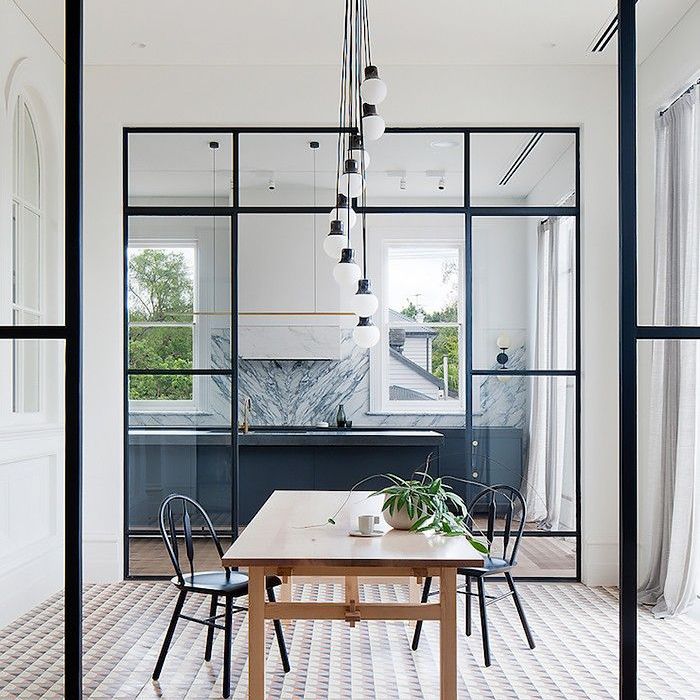 一些房主仍然喜欢把厨房和餐厅分开。一个很好的替代方案是用大的钢框架门来分隔空间,这提供了视觉上的分离,但仍然保持两个空间的连接。