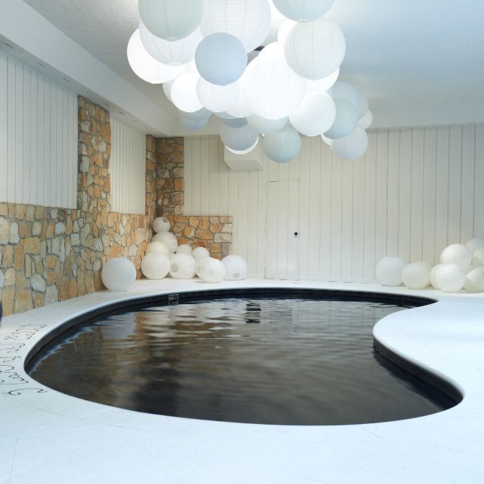 “既然我们不能在游泳池wire电气,相反,我们用不同大小的纸灯笼充满了天花板上。纸灯笼的集群软化的空间和房间其他部分的硬线条,同时也创造了一个美丽的反思暗池“。