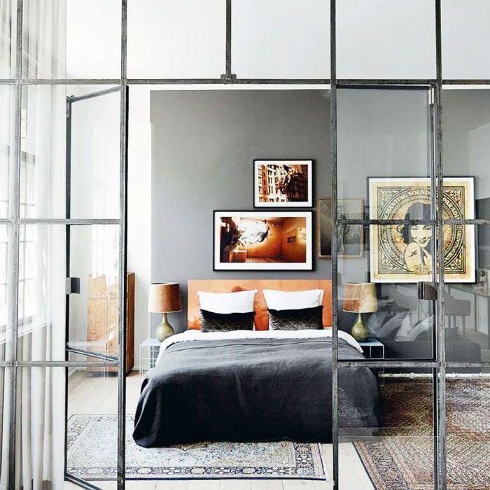 我们都应该如此幸运,住在一家玻璃厂一墙之隔从空间的其余卧室的阁楼。相反,我们建议模仿的地板到天花板的窗户工厂的结构细节和墙壁与家具结合了金属和玻璃(用于窗玻璃模式加分)。