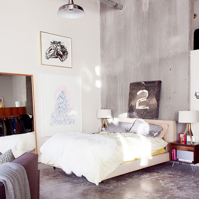 您不必住在阁楼带工业风格灌输你的卧室。让水泥和混凝土抛光表面启发的装饰,家具和照明选择以相同的结束。从那里,软化与不拘一格的现代艺术画廊风格搭配的产业要素。