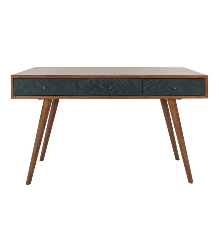 这个别致的世纪中期的书桌特点鲜明的海军蓝抽屉创建一个优雅和引人注目的调色板与山核桃木完成。