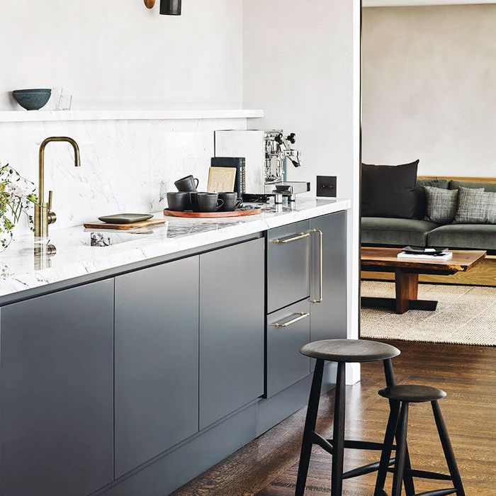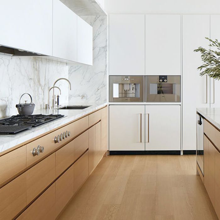 极简主义室内设计师质疑每一件物品的需求,包括硬件。从这个金色的木制厨房中寻找线索,选择有凹痕的橱柜,而不是抽屉拉手。