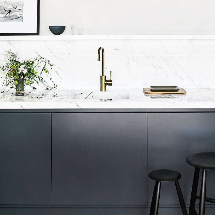 通过添加混合的金属细节来赋予你的厨房个性。Catherine Kwong Design选择了黄铜水龙头烛台上以平衡冷色调。