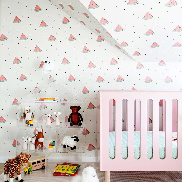 如何美味是这家幼儿园?我们正处在一个糖果的故事一个孩子只是看着这个西瓜的壁纸甜美的粉色婴儿床。