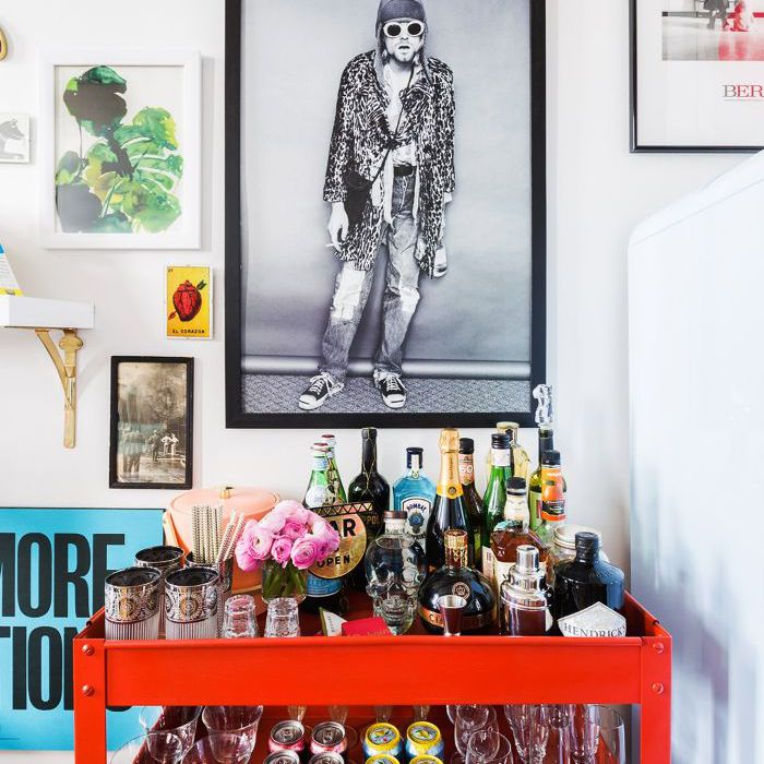 她说:“我的老式酒吧推车是长期以来的最爱。”我在一次庭院拍卖会上花了30美元买的。几层喷漆把它从一辆老式的AV车改成了一个很好的娱乐酒吧。我也喜欢我的薄荷绿柜台凳子从目标。我一直在网上寻找完美的凳子,最后我以每把75美元的价格找到了这些。”