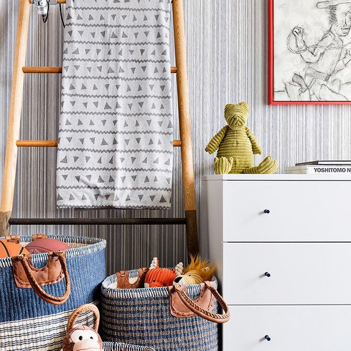 玩具和毯子被装在编织的篮子里,放在彭德尔顿的梯子上。楼的第三个房间被设计成酒店风格的客房——优雅而中性,就像房子的其他部分一样。