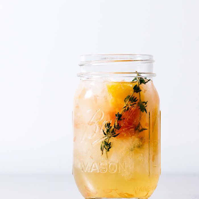 这清脆的夏日承担的老式用百里香糖浆开始从水,糖和新鲜百里香制成。一旦糖浆已冻僵,橙,柚,波旁威士忌和苦味结合起来。添加苏打水,然后倒在冰上。