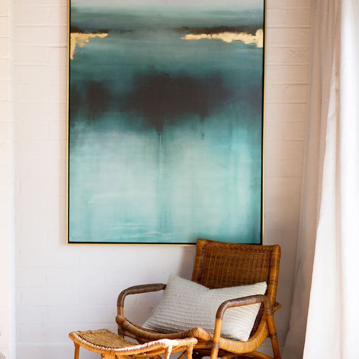 “我们遇到了这门艺术从žGallerie,和客户的喜爱美丽的绿松石色调和黄金。我们用竹躺椅和舒适的羔羊毛枕头完美的一本书蜷缩配对它的小细节,”巴勃罗和Korenberg说。