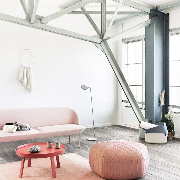 这个空间使用色块来聚焦家具上的眼睛。整个房间保持灰色和白色的色调,而家具都是珊瑚色和粉红色的各种色调。