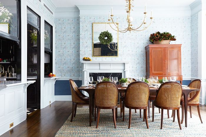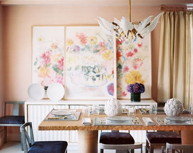 在纽约的公寓里Celerie肯布尔在餐厅里注入了女性的精华,在墙上覆盖了一层粉红色的草布墙纸。既然每个人在粉色房间里看起来都很棒,我们敢打赌这会让客人在餐桌前逗留更长时间。