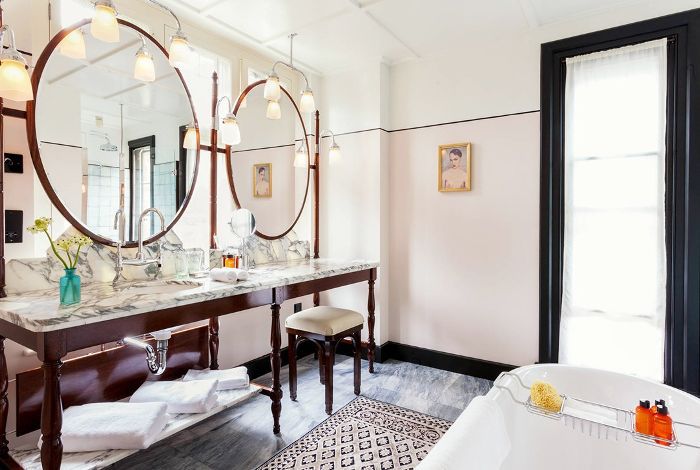 在酒店老板安德烈·巴拉兹的最新房产中,奇尔特恩斯消防站的在伦敦的玛丽莱博恩区,浴室的墙壁被漆成柔和的粉红色,并以光滑的黑色镶边、纹理丰富的大理石装饰物和复古家具为特色。结果是一个柔软,优雅的房间,给每个人一个温暖的辉光,使准备好了很多。