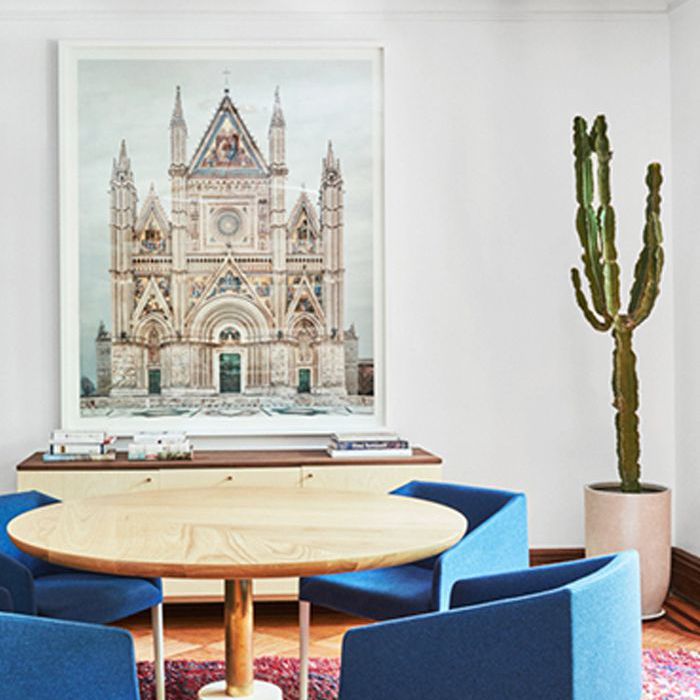 称所有的极大化者——这个空间散发出一种独一无二的自信、奇思妙想和创造力。我们喜欢钴蓝色的椅子、淡桃红色的砖墙和橄榄绿色调之间的对比,以及大胆的黑金灯具将空间连接在一起。