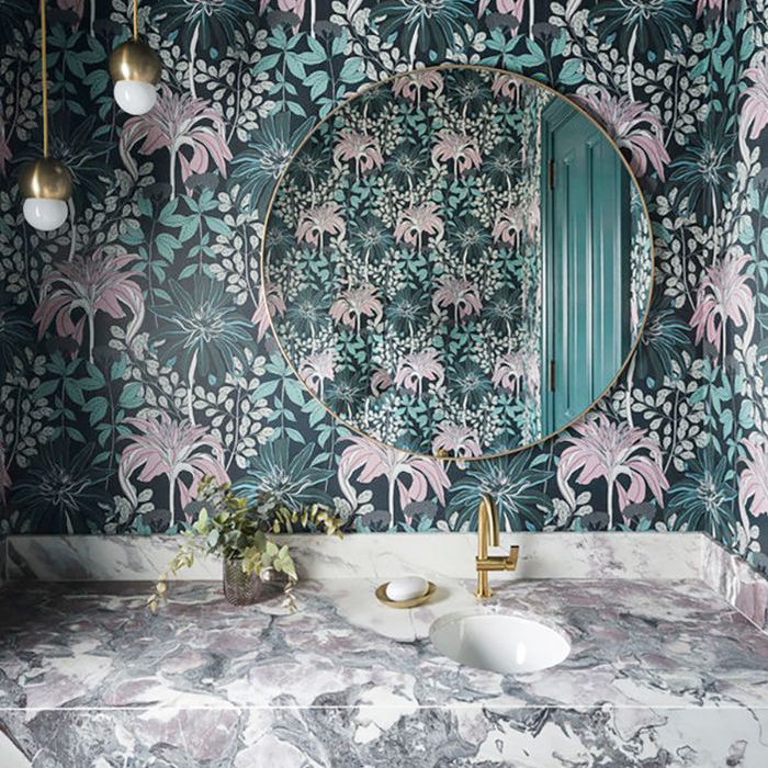 螺旋形的深灰色和柔和的棉花糖色调,这个浴室柜台是引人注目的。我们喜欢墙纸的选择,它反映了自然的图案和配色方案。