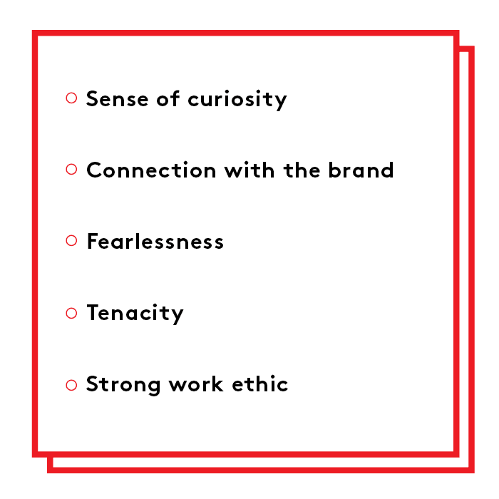 “A的好奇感。与品牌的连接。无畏,坚韧,强大的工作热情和那种‘火在最肚’的工作热情。”