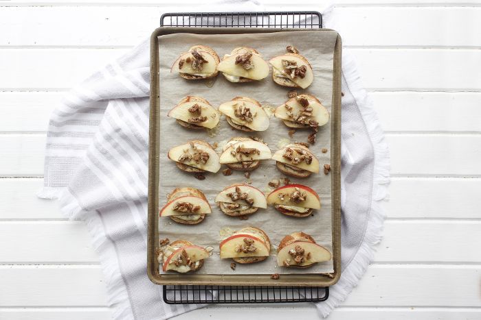 6.从烘箱中,并用苹果片顶部取下crostini。洒定期或蜜饯山核桃均匀地分布在crostini,与蜂蜜毛毛雨。