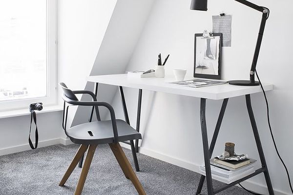 该办事处的美在高/低混合。她的办公桌是宜家桌面与小资椿木独特的双腿,用一种罕见的古董椅子相匹配的组合。