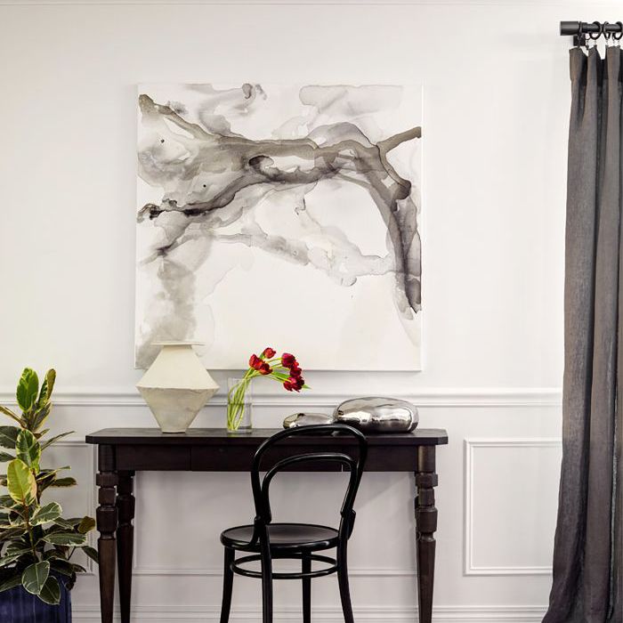 整个家庭,黑色和白色海军和金属口音出现的颜色方案。“[客户端]被吸引到高对比度配有黑色和白色,但他们还与海军几张图片。我们专注于这些颜色,混合金属,并在短短的腮红和勃艮第的口音带来的,”设计师说。