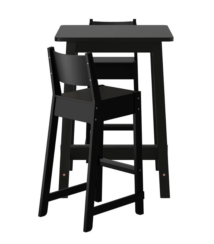 舒舒服服地坐在身边这个小宜家厨房的桌子上。它配备了创造更多的空间错觉明确椅子。