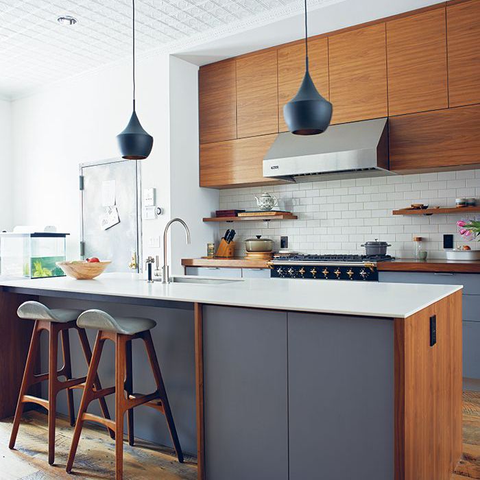 当设计一个小厨房(尤其是预算有限的),就得保持经典所以它代表了时间的考验。但是,这并不意味着你应该完全关闭的设计趋势。“一个在美学方面我个人最喜欢的是使用铜器和橱柜旋钮和把手暖色调的金属(铜和玫瑰金色调显得格外美丽反对灰色橱柜,这表明没有失去普及的迹象),”向风说。“天然木材也是大新闻,是否回收和痛苦或作为一个时尚贴面,而我认为没有把手的橱柜是,将是一个很长的时间电流的样子。”