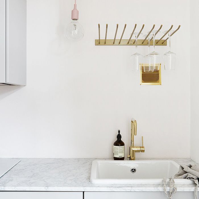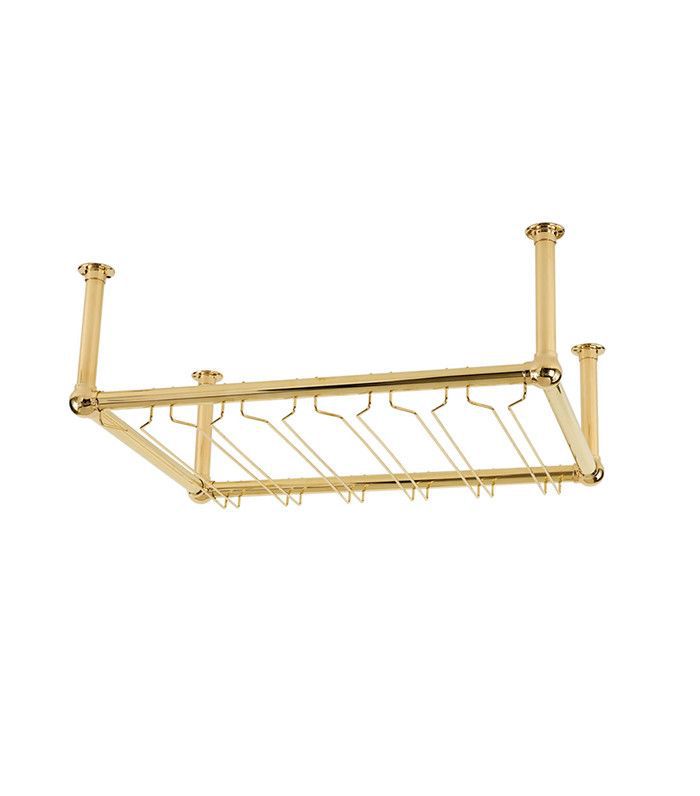 如果你的橱柜空间有限,但你收藏的玻璃器皿很多,试着把它们倒挂起来,像酒吧那样。玻璃器皿架可以挂在墙上,也可以挂在碗柜下面,这样就可以腾出空间来摆放其他的餐具,同时也可以展示你收藏的酒杯。