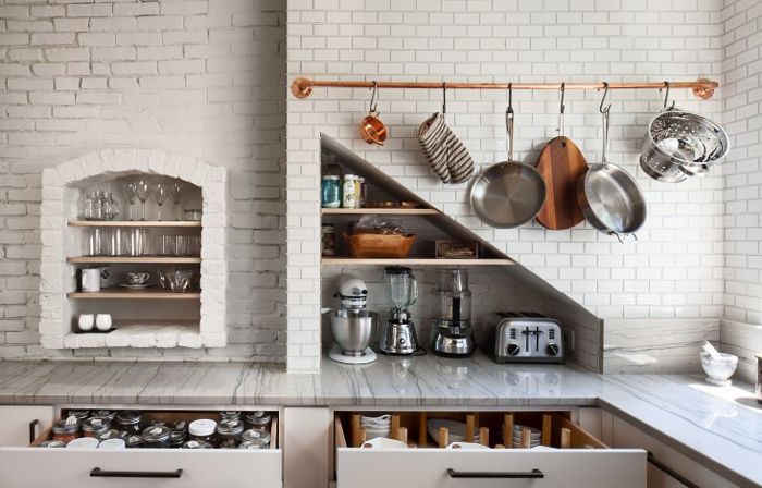 空的或尴尬的角落是添加额外存储空间的完美地方。架子、橱柜和小房间很容易就能塞进这些未被充分利用的区域,并为装饰展示或存放难看物品的地方提供了独特的机会。