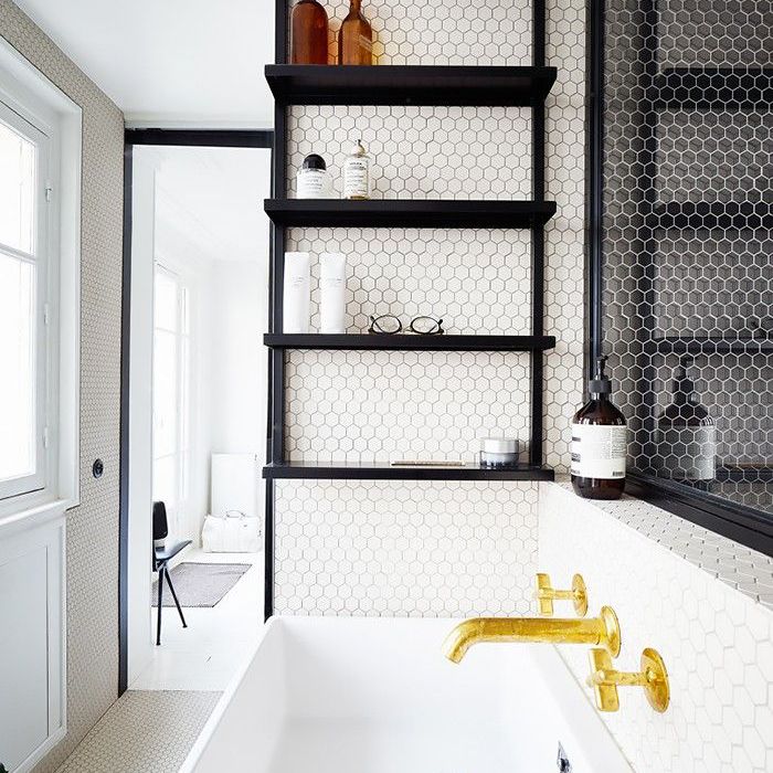 柜台空间是一个小浴室里令人垂涎的奢侈品。把水龙头和控制杆安装在墙上,腾出一些空间来存放和展示。用新腾出的地方放上化妆罐和化妆盒,把你必须要用的美容用品藏起来。