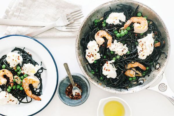 为什么我们喜欢它:从柏拉图+配对中与虾和鱿鱼墨食意大利面完美的虾和鱿鱼墨面配对。樱桃西红柿,罗勒和虾也加入漂亮的颜色对比盘。