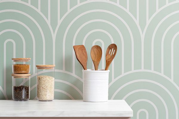 对于一个更女性化的地铁瓷砖,我们喜欢这样的想法:只在墙上一半的地方使用它,并添加一个花瓣风格的墙纸来软化整体外观。一个别致的梳妆台凳子完成了整个造型(并为装饰增添了一个时尚的空间)。