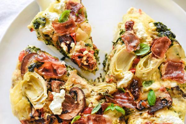 这些迷你菜肉馅煎蛋饼充满了地中海风味。将鸡蛋、牛奶、洋蓟、卡拉马塔橄榄、甜红辣椒、晒干的西红柿和奶酪的混合物倒入迷你松饼罐中,提前烘烤,在路上享用。