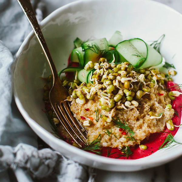 配方:对于营养物质的一个生动的碗看起来漂亮,因为它的味道,使第一混乱的发芽的绿豆和椰子藜碗甜菜芝麻酱。