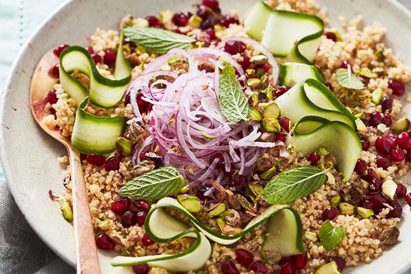 风味注意:由于藜是超级湿润,它可以翘起到类似的蒸粗麦粉的稠度。