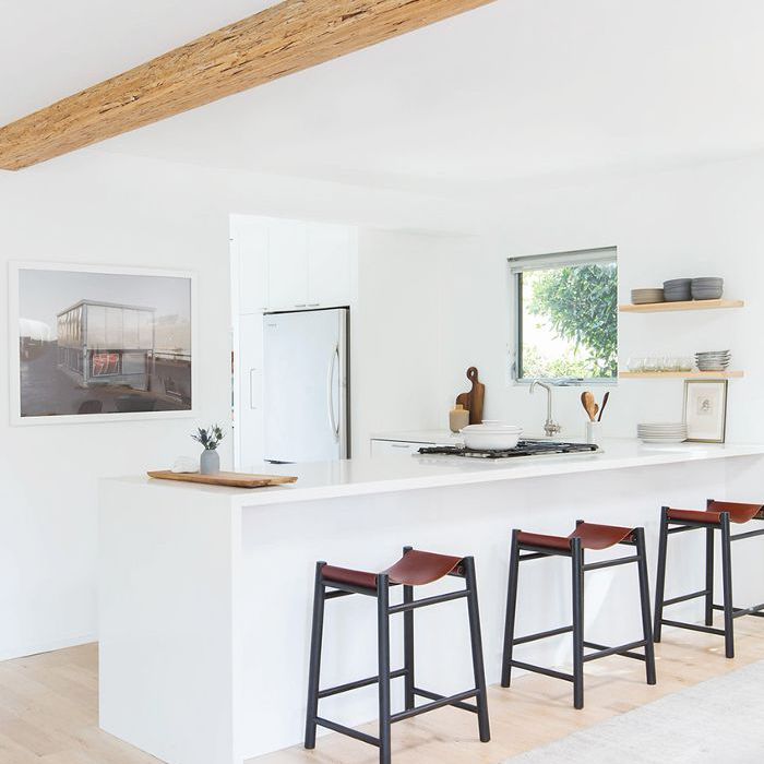全白色的外观是在这个现代化的厨房温暖的暗示很明显,由于木地板,货架,和横梁。该酒吧椅还增加深度和质感光滑柜台表面。