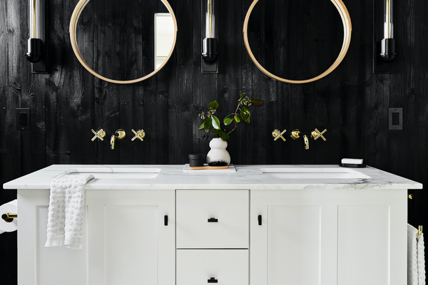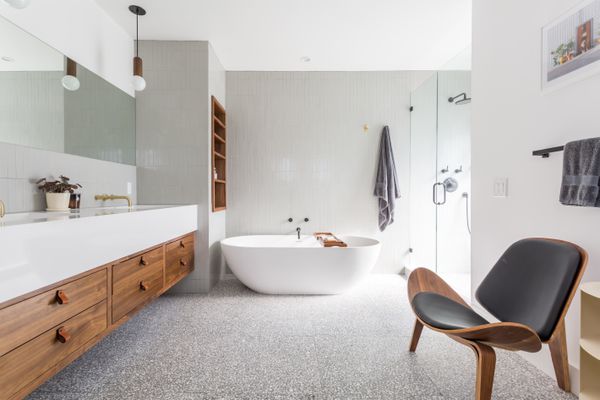 这种光线充足的浴室由团队设计透明&·派克拥有一个最小的灰色和白色调色板,平衡了温暖的木材色调和黑暗的硬件。在步入式淋浴时,一个拱形的淋浴头会吸引眼球,打开空间——这是我们模仿的一个巧妙的技巧。