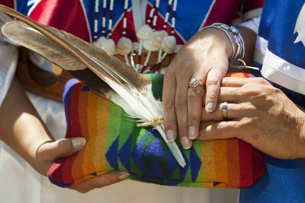 在婚礼上,这对夫妇各自从花瓶里喝了一小口水,然后同时从花瓶的双壶嘴喝水——这象征着两个不同的生命合二为一,Kachina House的博客继续写道。相信那些不用洒一滴就能完成这项任务的人会得到极大的祝福。